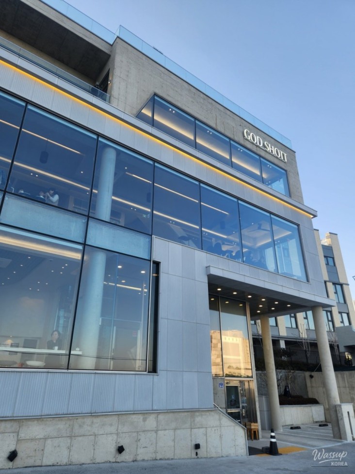 The exterior of GOD SHOOT, an ocean view cafe in Songjeong, Haeundae, Busan.