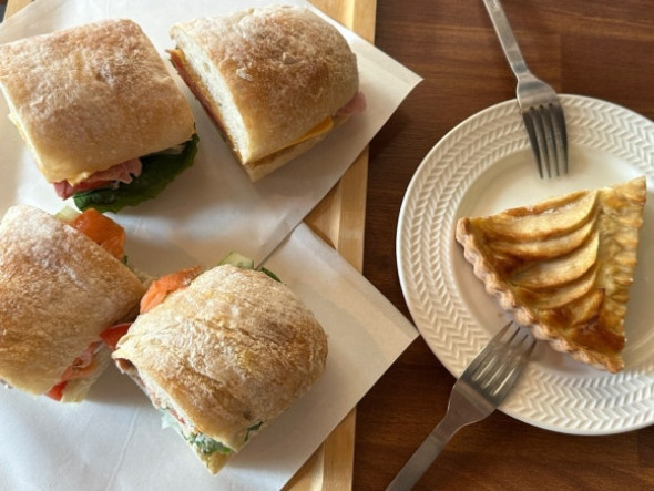 Ham & cheese sandwich, salmon sandwich, and apple tart!