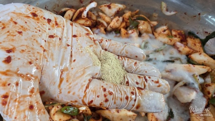 The ingredients you'll need are: chili powder, garlic, green onions, onion, ginger powder, fish sauce, salted shrimp, cooked rice, sea salt, and sugar.