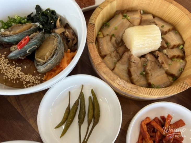 The signature dish, seafood bibimbap, includes seafood marinated in a special sauce made with octopus, abalone, and mantis shrimp. The fresh seafood, rice, vegetables, and special sauce blended together to create a savory and rich flavor. The mantis shrimp in particular was incredibly flavorful, and the octopus was chewy yet tender, making it fun to eat.