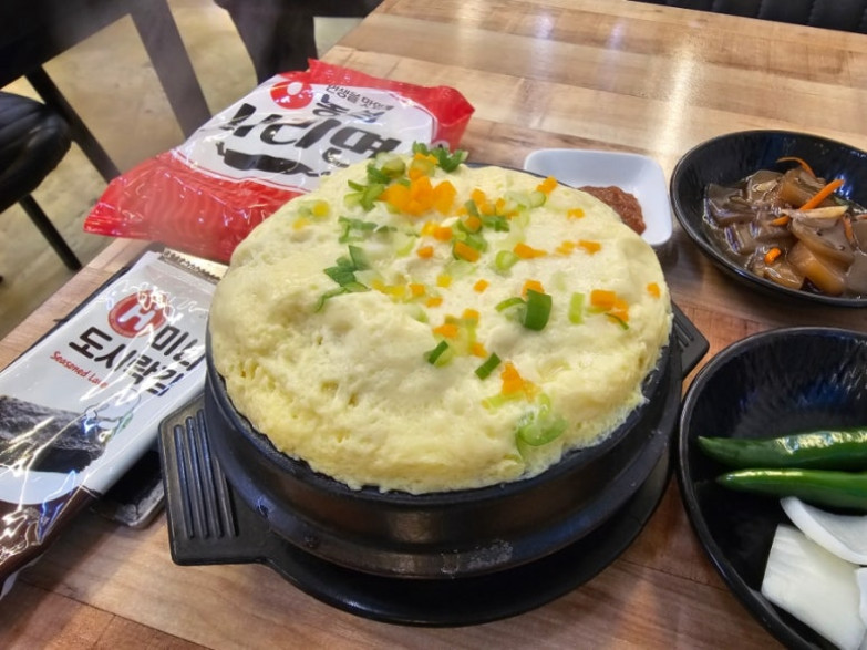 I ordered a single serving of pork stew and a steamed egg dish. You can choose between spicy and regular flavors, and the owner recommended the spicy version, saying it's about as spicy as Shin Ramyun.