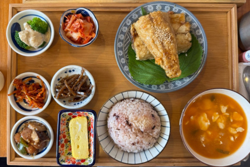 In addition to the main dish, there were various side dishes such as rolled omelet, braised burdock, sausage, seasoned dried squid, kimchi, and broccoli, as well as warm soft tofu soybean paste stew.
