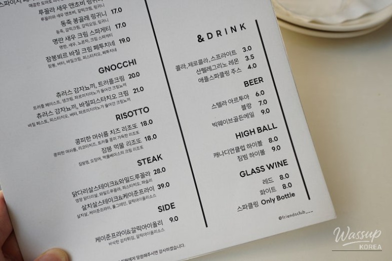 I visited 'Friends Club,' a pasta restaurant in Jeonpo, because I wanted some rich, creamy potato gnocchi. Friends Club in Jeonpo is a restaurant that sells pasta and other Western dishes. It was a great place for dates or gatherings because it offered attractive Western dishes in an open space.
