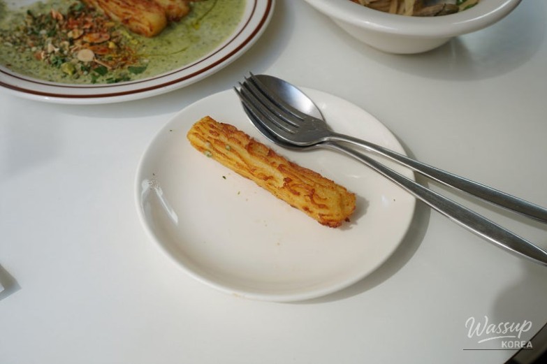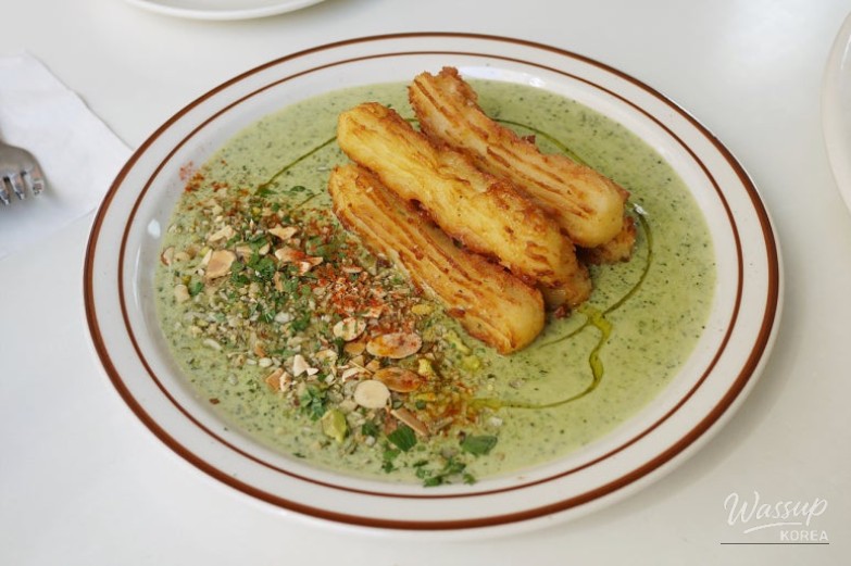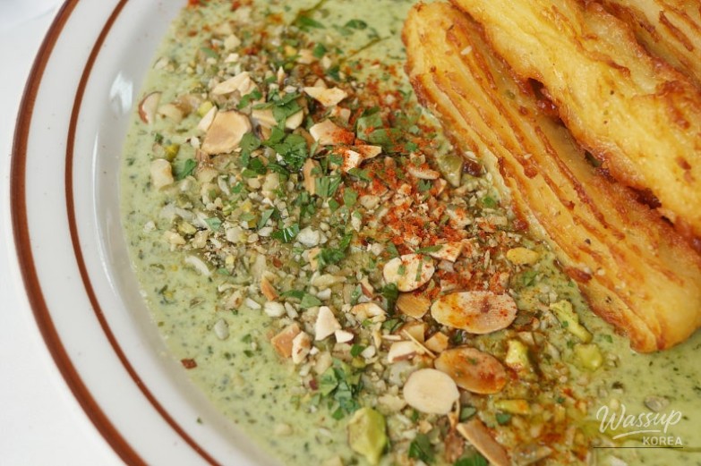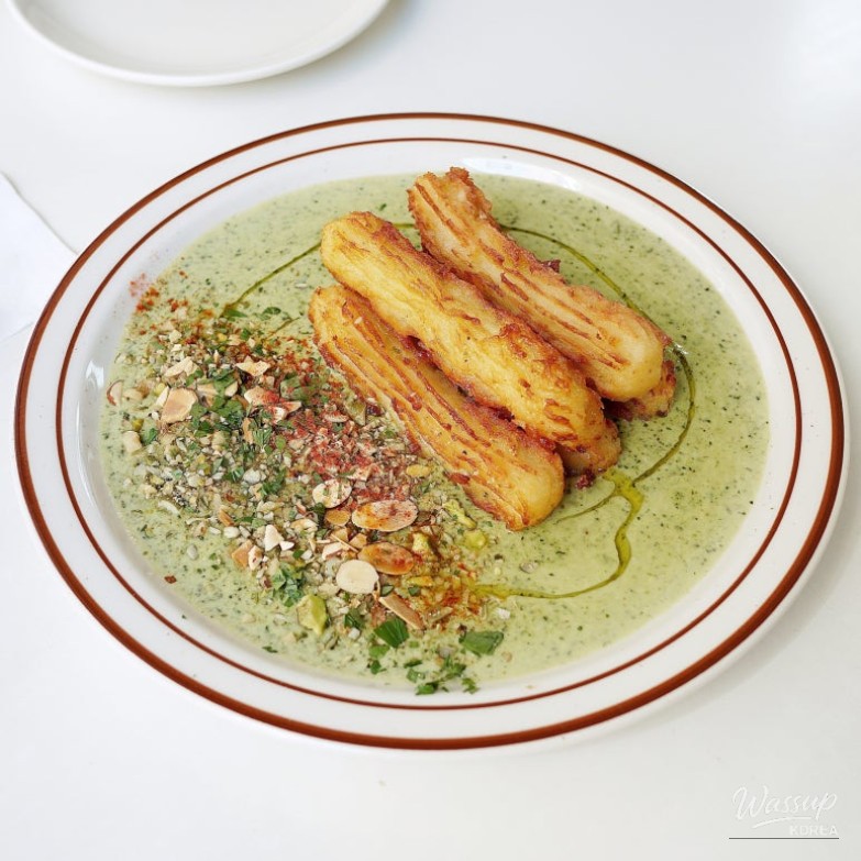 Since the menu name is Basil Pistachio Cream Churro Potato Gnocchi, the gnocchi is shaped like churros. Thanks to this, you could enjoy a crispy outside and soft inside texture. It was a gnocchi menu where you could feel great happiness if you added plenty of the savory and soft cream that comes with it.