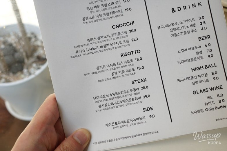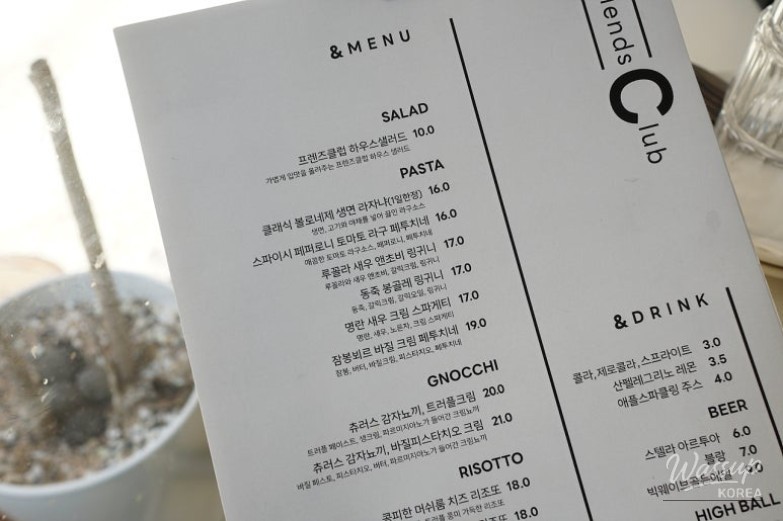 As I mentioned earlier, you can feel a bright atmosphere in the open space of Friends Club in Jeonpo. There was a long shared table and seats that were good for eating alone. We sat at a regular table and enjoyed pasta and potato gnocchi. As a Western restaurant, there was a variety of menus such as pasta, gnocchi, and risotto.
